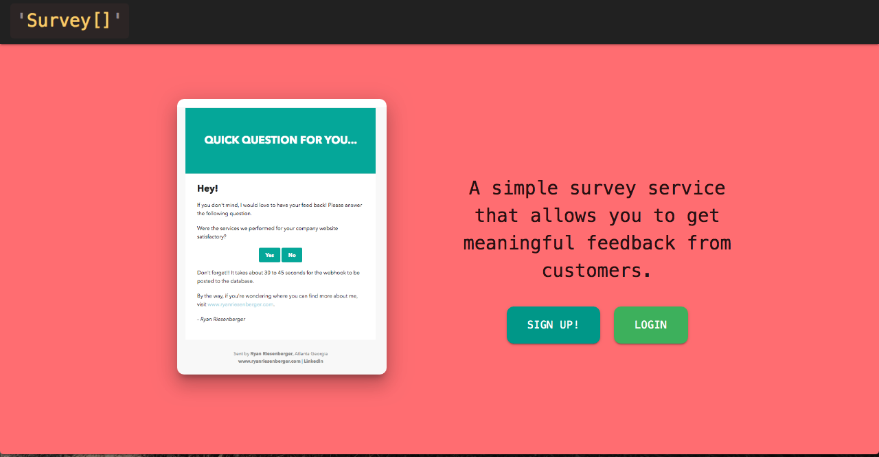 SurveyArray is a large feedback-collection app. This mega app includes the full gamut of features, including everything from google or facebook authentication to email handling with react hooks. The app can be used to send mass emails to a big list of users for the purpose of collecting feedback.